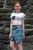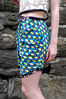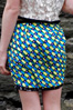 Contains: Teal printed silk cotton blend skirt, with origami fold design and black and white print edging.