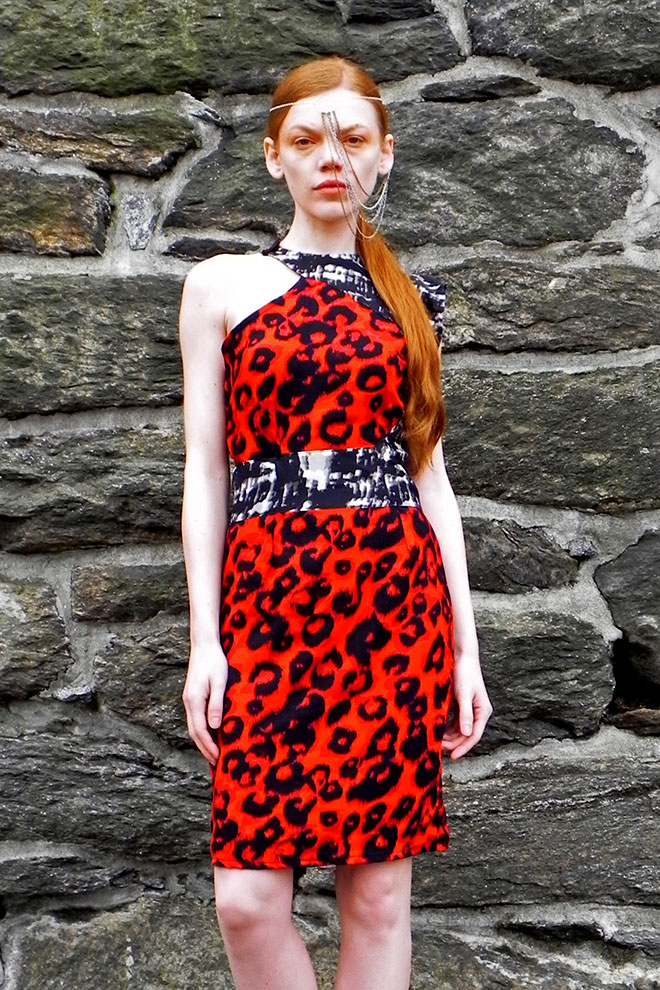Contains: Red leopard print cotton blend cocktail dress with accented neckline and sleeve.