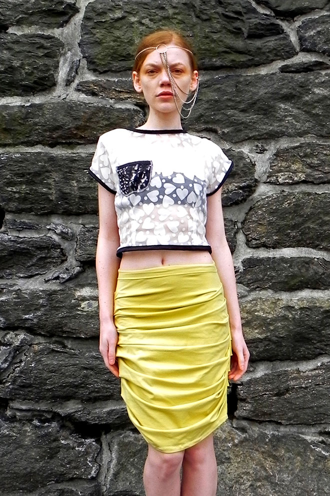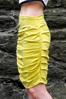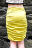 Contains: Rayon and cotton blend yellow knit skirt with rouging along sides