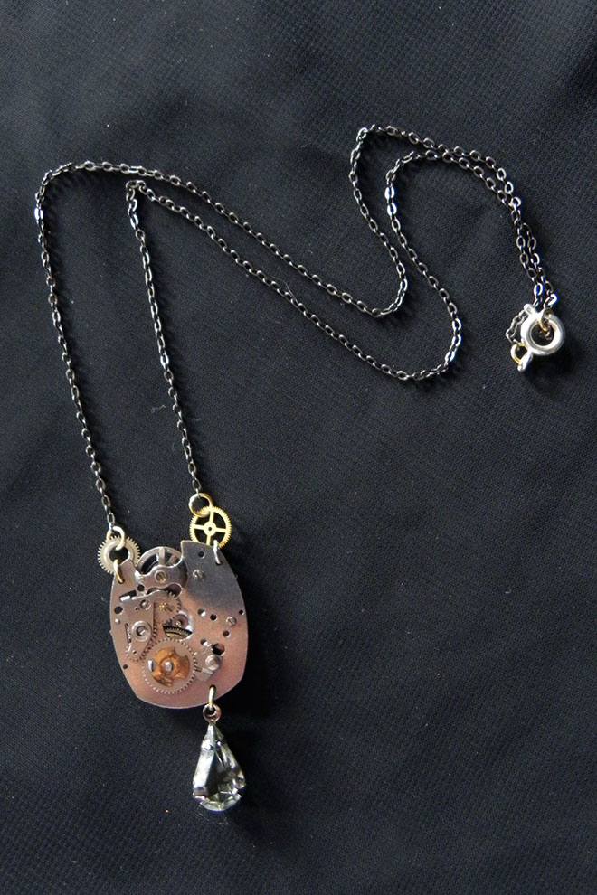 Contains: Gold/silver plated chain necklace with a large watch piece pendant and accents. made from pieces of a vintage watch. one of a kind.